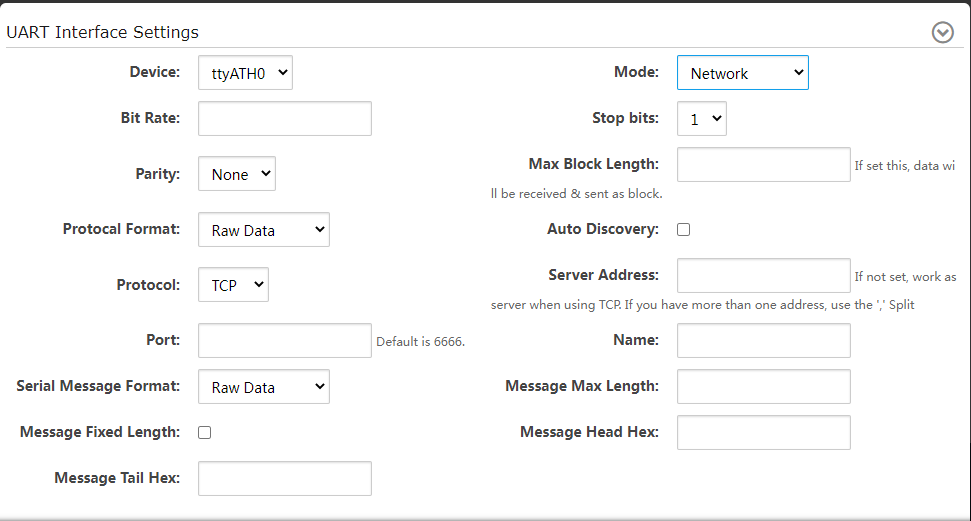 Atención, si utiliza el puerto serie para transmitir datos serie, tienes que elegir ttyS0 (COM1 de hardware) y ttyUSB0 (COM2 de hardware), ttyATH0 no es válido, modo: red