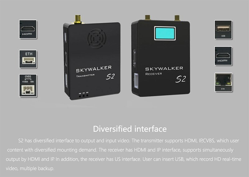 S2 tiene una interfaz diversificada para salida y entrada de video. El transmisor admite HDMI / IP / CVBS, qué contenido de usuario con una demanda creciente diversificada. El receptor tiene interfaz HDMI e IP, admite salida simultánea por HDMI e IP. en adición, el receptor tiene una interfaz de EE. UU.. El usuario puede insertar USB, que graban video HD en tiempo real, copia de seguridad múltiple. y tiene una pantalla de visualización OLED en el receptor,Indique claramente la fuerza de la señal actual y la información de grabación de video.. Todas las operaciones solo deben realizarse con un botón.