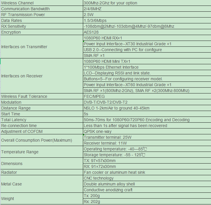 Այս մինի հաղորդիչը մշակվում է հիման վրա COFDM Տեխնոլոգիա `300mhz-2ghz- ով` ձեր տարբերակի համար `NLOS վիդեո փոխանցման համար. Այն լայնորեն օգտագործվում է ռոբոտների հիմքի համար 1-2 կմ-ի NLOS միջավայրի HD տեսանյութերի փոխանցում, 50ms լատենտությամբ.