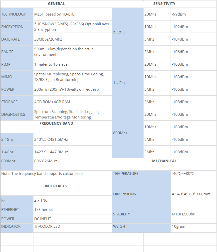 supports multi-frequency band: 800Mhz/1.4Ghz/2.4Ghz. It provides high bandwidth Ethernet for size and weight applications such as remote video, วิทยาการหุ่นยนต์, and other wireless Ethernet data transmitting systems.